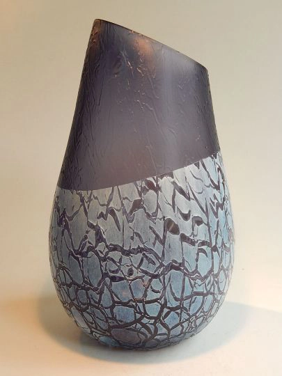 La deuxième partie du travail s’effectue à froid. Lors du sablage, Floriane Tourrilhes masque à moitié la couche de verre noir, afin que l’autre partie soit attaquée par le sable projeté, et laisse apparaitre entièrement le bleu sous-jacent du dessous, présentant encore le relief des craquelures, mais avec un toucher plus doux, une texture plus mate. Le haut du vase est poli et brillant. Par contraste, la base du vase, laissée brute, évoque le moment de la germination où la jeune pousse s’extirpe de la gangue de sa graine en la craquelant.