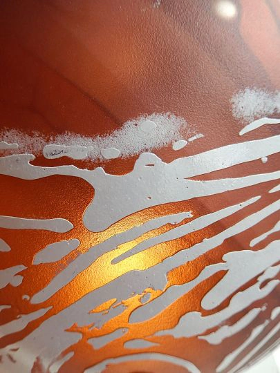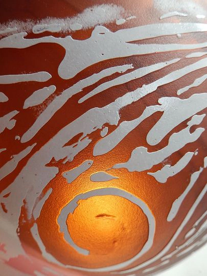 Pour créer les motifs cosmiques, l’artiste a dû effectuer un long travail de sablage à froid. La couche de verre blanche est masquée par endroits, afin qu’à d’autres elle soit attaquée par le sable projeté, et laisse apparaitre les rouges du dessous, qui présentent alors des effets moirés. La puissance du jet de sable est adaptée suivant le rendu de texture souhaité ; parfois c’est une découpe nette, parfois un effet nébuleux. Le travail a été extrêmement minutieux. Le jeu de couleurs et de textures est à la hauteur des espérances de la créatrice : une planète de verre à explorer, sans jamais se lasser.